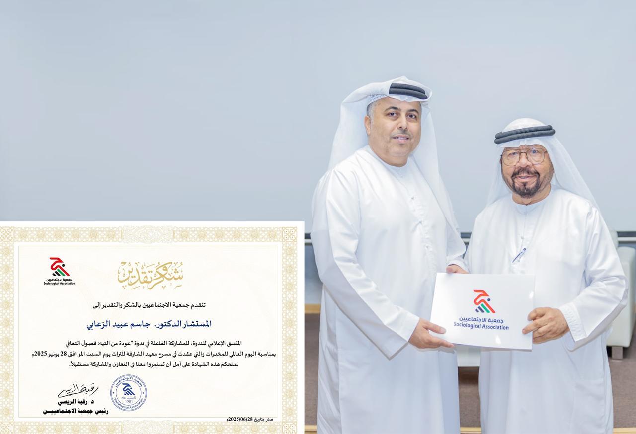 أتقدم بجزيل الشكر والتقدير إلى الدكتورة رقية الريسي رئيس جمعية الاجتماعيين وإلى الدكتور صلاح المزروعي نائب رئيس الجمعية والدكتور محمد حمدان بن جرش رئيس اللجنة الثقافية عضو مجلس الادارة والزملاء أعضاء الجمعية على التفضل بتكريمي كمنسق إعلامي في ندوة عودة من التيه فصول التعافي والتي اقامتها الجمعية بمناسبة اليوم العالمي لمكافحة المخدرات.