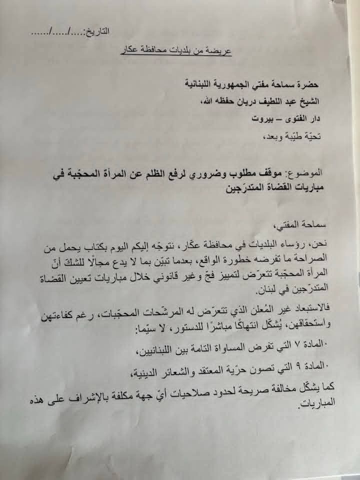 إن بلديات عكار مدعوّة اليوم لاتخاذ موقف واضح، صريح، وموحّد دفاعًا عن حقوق بناتنا وأخواتنا، وعن القيم الدستورية التي لا يجوز المساس بها تحت أي ذريعة.