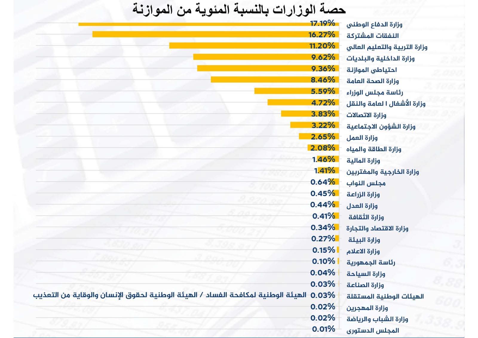 ثم عرض موازنات الوزارات فقدّم ناجي شرحًا واضحًا بالأرقام والنسب المئوية مُفصّلًا حصة كل وزارة من الموازنة وأبواب النفقات الواردة فيها
