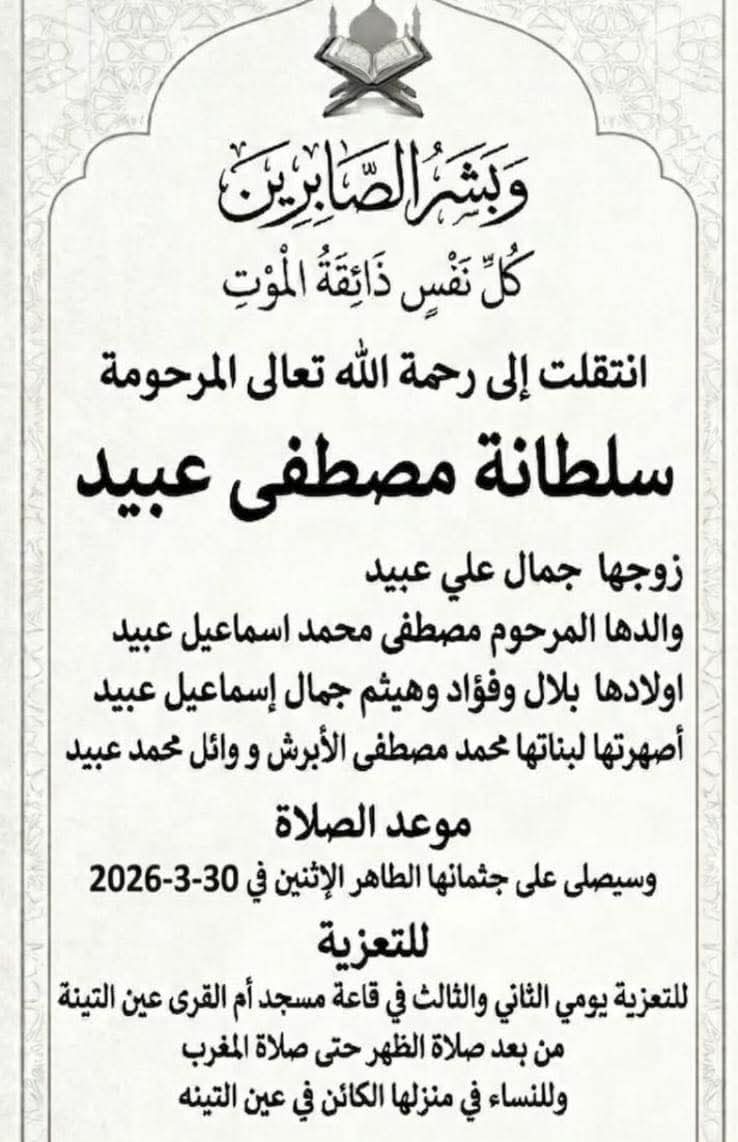 نعت إدارة مستشفى طرابلس الحكومي ببالغ الحزن والأسى الموظفة المرحومة سلطانة مصطفى عبيد التي وافتها المنية بعد مسيرة من العطاء والتفاني في خدمة المستشفى والمرضى.