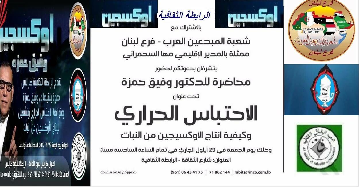 بدعوة من الرابطة الثقافية في طرابلس وشعبة المبدعين العرب فرع لبنان برئاسة المدير الاقليمي الشاعرة مها السحمراني ، ستقام محاضرة بعنوان الاحتباس الحراري للدكتور المصري وفيق حمزة في الرابطة الثقافية الساعة السادسة من مساء الجمعة في 29 أيلول الجاري ..
