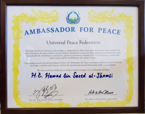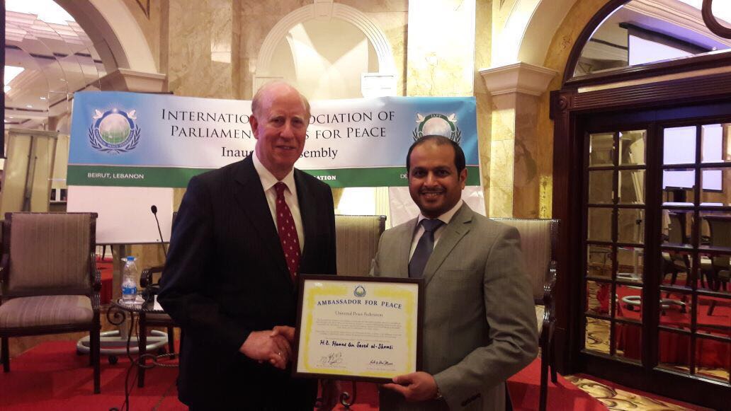 منح رئيس الفيدرالية العالمية للسلام (Universal Peace Federation) د. توماس والش سفير دولة الامارات العربية المتحدة لدى الجمهورية اللبنانية سعادة السفير د.حمد سعيد الشامسي لقب “سفير السلام” وذلك خلال “مؤتمر السلام” الذي نظمته الفيدراليه في فندق فينيسيا بمشاركة عدد من البرلمانيين الذين يمثلون الدول الاوروبية والعربية على حد سواء.