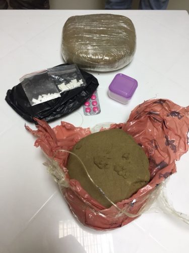 داخل سيارة مرسيدس، وضبطت بداخلها 2 كيلو و100 غ. من مادة حشيشة الكيف، وحوالي 8 غ. من مادة باز الكوكايين ومظروف حبوب مخدرة.