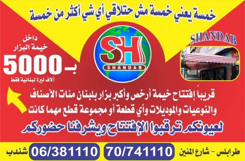 أعلن المستشار الإقتصادي وصاحب ورئيس مجلس إدارة مؤسسة (ملك التوفير) شندب مصطفى شندب عن إفتتاح خيمة أرخص واكبر بازار في لبنان مئات الأصناف والأدوات الكهربائية تحت عنوان (خمسة يعني حمسة) في طرابلس ..