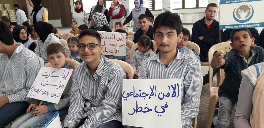 تحت شعار الامن الاجتماعي في خطر ناشد المشاركون المعنيين تفادي اي خلل مالي يصيب المؤسسات وبالتالي يصيب حقوق اطفالهم في الرعاية والتأهيل والتدريب