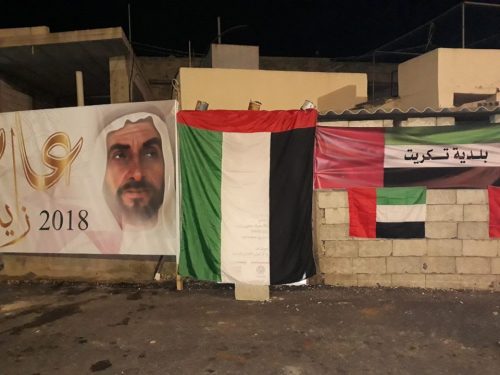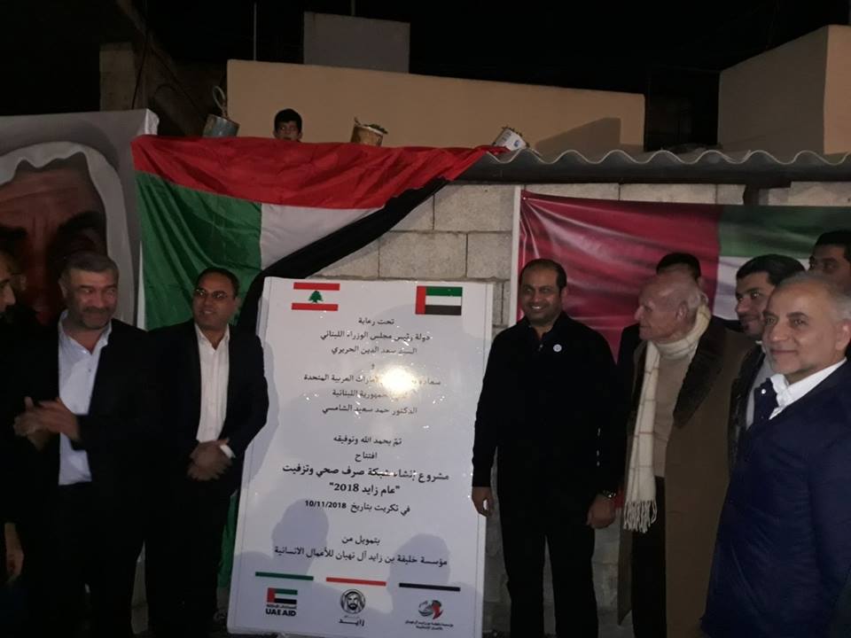 برعاية رئيس الحكومة الشيخ سعد الحريري، ازاح وزير الدولة لشؤون النازحين معين المرعبي، وسفير دولة الإمارات العربية المتحدة الدكتور حمد سعيد الشامسي، ورئيس بلدية تكريت غبدالله غية الستارة عن اللوحة التذكارية لمشروع انشاء شبكة صرف صحي وتزفيت في البلدة بتمويل من مؤسسة خليفة بن زايد آل النهيان للأعمال الإنسانية ، وذلك بمناسبة “عام زايد 2018″، بحضور فعاليات وحشد من ابناء تكريت.
