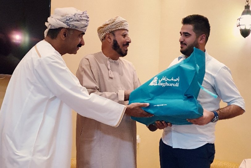 هدية السفير الشيخ عبدلله بن زاهر الحوسني للفنان خالد رستم دهن العود على شكل خنجر ال سعيد العماني من شركة اصغر علي قام بتسليمها نيابة عنه قائد الجيش العماني السابق اللواء سعيد السالمي