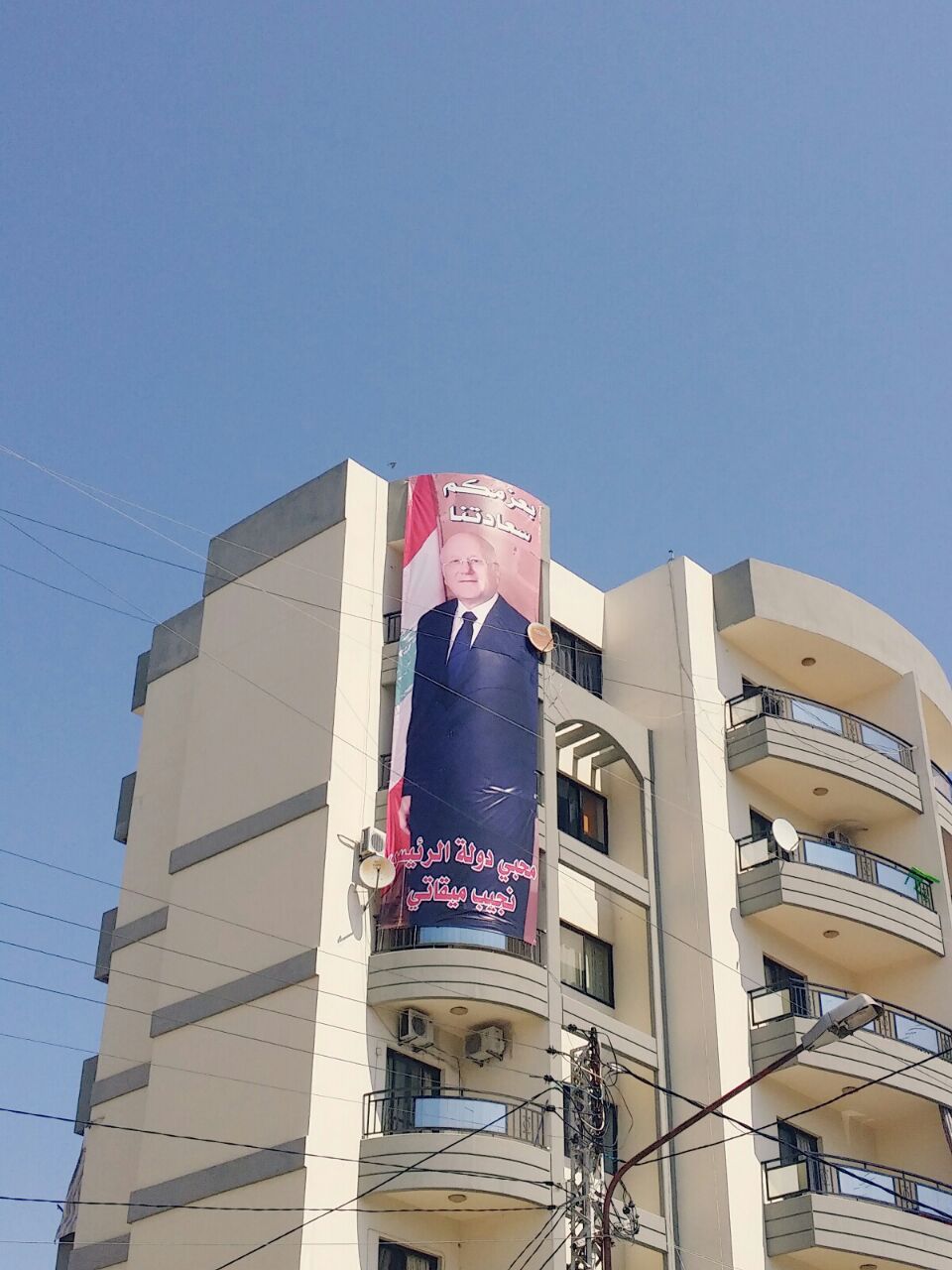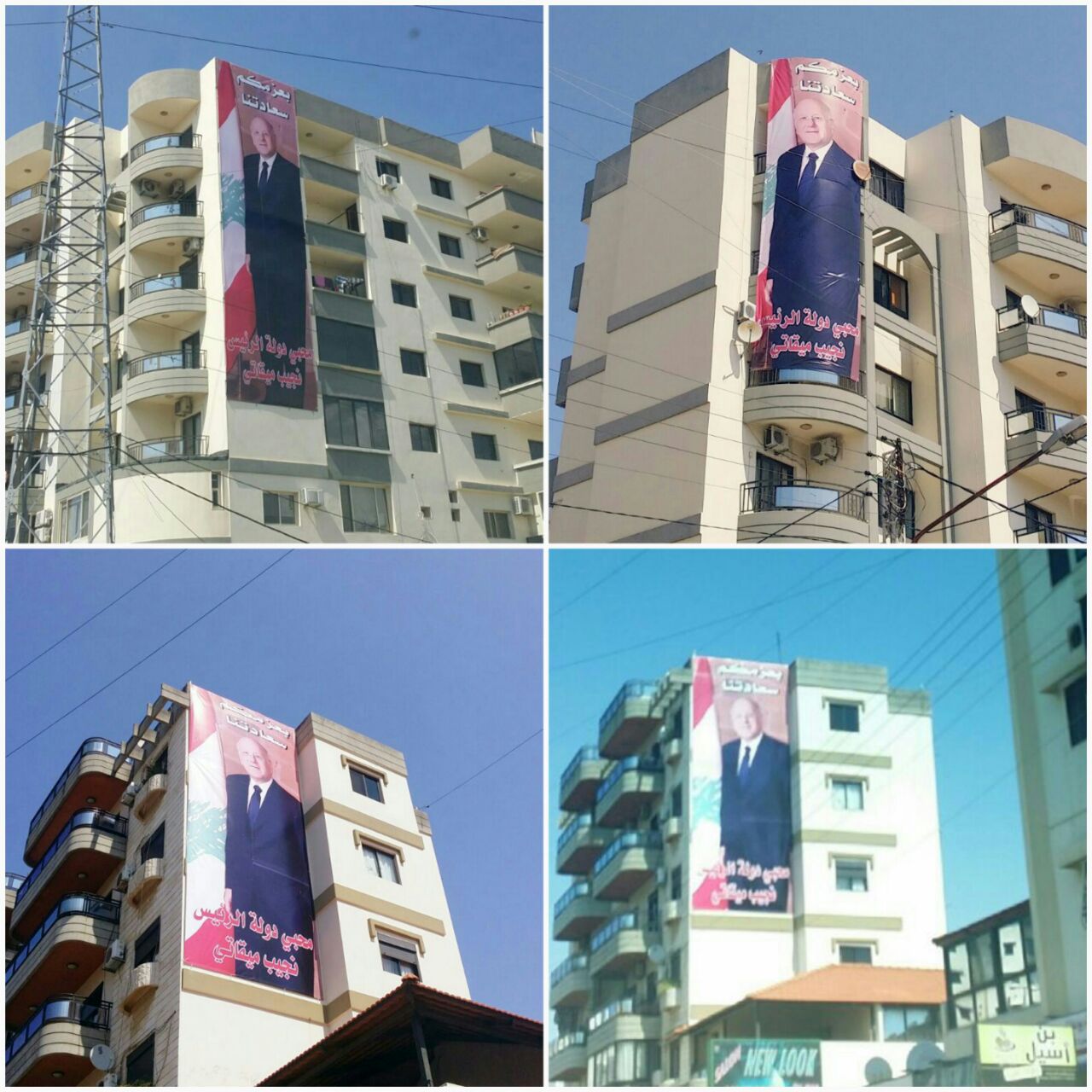 صور عملاقة للرئيس نجيب ميقاتي فوق المباني رفع صور عملاقة لدولة الرئيس نجيب ميقاتي على عدد من المباني في أبي سمراء من قبل فريق محبي دولة الرئيس نجيب ميقاتي