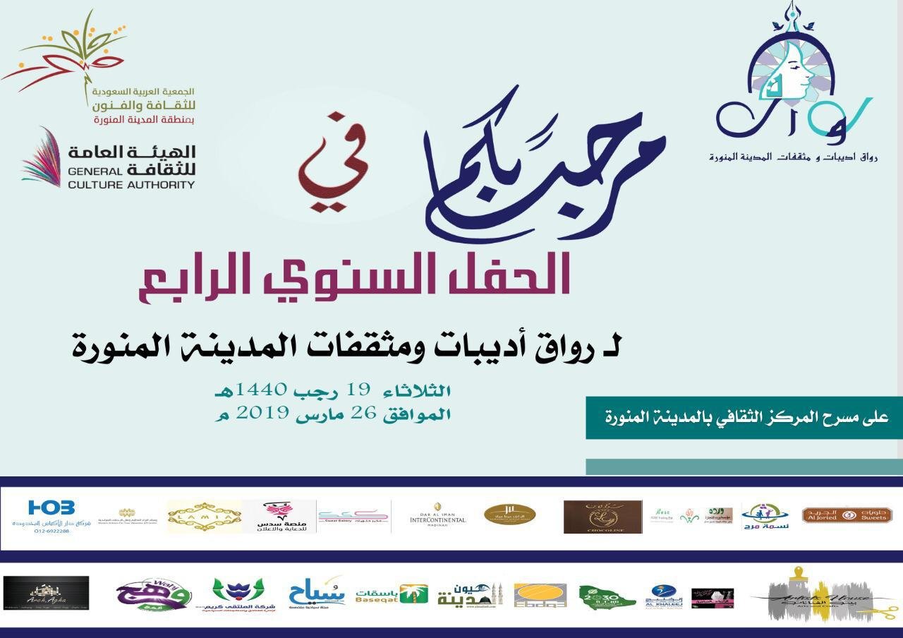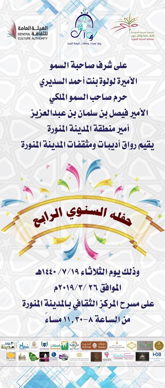 على شرف سمو الأميرة لولوة بنت أحمد السديري حرم صاحب السمو الملكي الأمير فيصل بن سلمان بن عبد العزيز أمير منطقة المدينة المنورة ، أقام رواق أديبات ومثقفات المدينة المنورة الثلاثاء ١٩ رجب١٤٤٠ الموافق ٢٦ مارس٢٠١٩ حفله السنوي الرابع بحضور عدد كبير من قياديات الجهات الرسمية والأهلية وسيدات مجتمع المدينة المنورة .