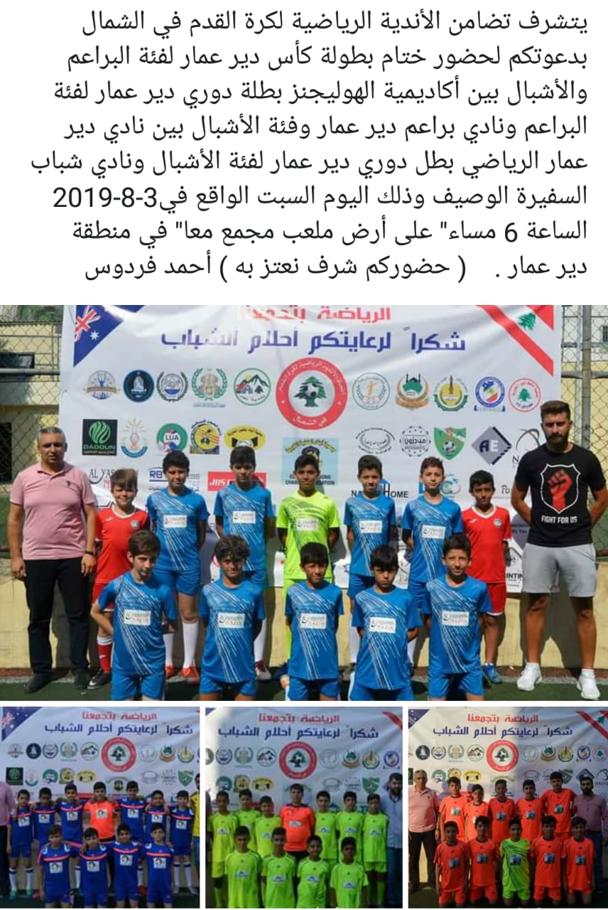 برعاية وحضور رجل الخير والعطاء أحد وجهاء الجالية اللبنانية في أستراليا الاستاذ محمد ضاهر أقيم يوم الجمعة نهائي بطولة كأس الضنية لفئة البراعم بين نادي النهضة بيت الفقس بطل دوري الضنية لفئة البراعم ونادي نمرين الوصيف على أرض ملعب بطرماز حيث فاز نمرين بنتيجة 1-2 بضربات الترجيح بعدما تعادلا بالوقت الأصلي بنتيجة 1-1 محققا” لقب بطولة كأس الضنية لفئة البراعم ليتأهل إلى بطولة كأس أبطال الشمال التي سوف تنطلق بتاريخ يوم الأحد في 2019-8-18 على ملاعب العطور في منطقة أبي سمراء ،أما في بطولة كأس الضنية لفئة الناشئين فقد فاز نادي بطرماز على نادي أنصار حرف سياد بنتيجة 0 – 3 محققا” لقب بطولة كأس الضنية لفئة الناشئين ، كما حقق لقب بطولة دوري الضنية لفئة الناشئين ليكون النادي الرابع الذي يحقق بطولة الدوري والكأس بعد أكاديمية ASA طرابلس وأكاديمية المواهب جبل محسن ونادي الجمهور المنكوبين وليتأهل إلى بطولة دوري أبطال الشمال وكأس أبطال الشمال التي سوف تنطلق بتاريخ يوم الأحد الواقع في 2019-8-18 على أرض ملاعب العطور في منطقة أبي سمراء .https://m.facebook.com/story.php?story_fbid=1222450004632000&id=206888229521521