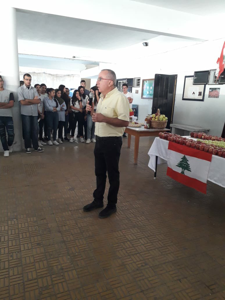 واضاف:”ان الهدف من احياء يوم التفاح اللبناني هو دعم القطاع الزراعي لأن الزراعة هي قضية ايمان ونحن كلنا ابناء قرى وابناء جرد وهذه التفاحة هي ابنة تنورين ودوما وشاتين ونيحا وكفورالعربي وابنة كل ضيعة لبنانية واذا لم نتربى عنه ونتعلم بفضل الزراعة فآباؤنا واجدادنا تربوا وعاشوا بفضل الزراعة. التفاحة هي قضية ايمان ببلدنا ووطننا وكلنا معنيون ان يبقى المزارع في ارضه وكلنا معنيون بتطوير الزراعة وتفاحتنا أشهى وأطيب من التفاحة وانتاجنا ترفع له القبعة.” وتمنى على الطلاب “في عائلاتكم ومنازلكم ومحيطكم دعم كل ما يشجع الانتاج الوطني والمزارع وبذلك نثبت المواطن في أرضه ونحد من النزوح الى المدينة الذي هو بمثابة الخطوة الاولى باتجاه الطائرة.”