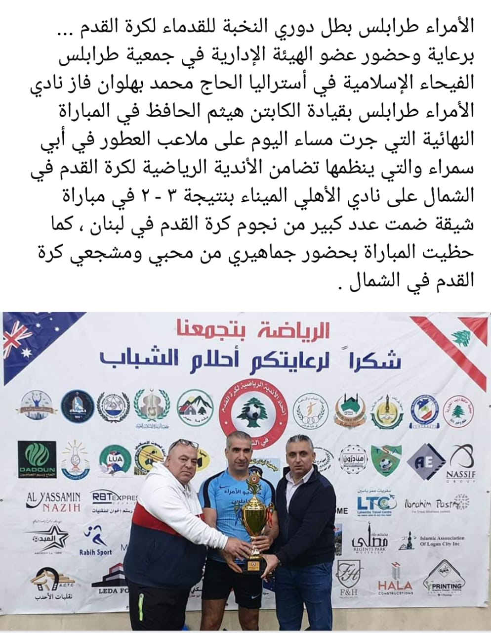 الرئيسية/منوعات/الرياضة/الأمراء طرابلس بطل دوري النخبة للقدماء لكرة القدم الرياضة الأمراء طرابلس بطل دوري النخبة للقدماء لكرة القدم ديسمبر 5, 2019 625 فيسبوك تويتر واتساب الشمال نيوز – عامر الشعار شارك هذا الموضوع:فيس بوكX ديسمبر 5, 2019 625 فيسبوك تويتر واتساب شاركها فيسبوك تويتر واتساب تيلقرام مشاركة عبر البريد طباعة