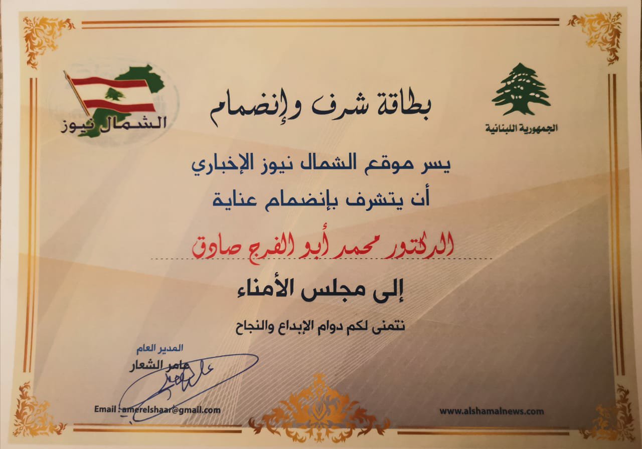 بكل فخر واعتزاز يتشرف مجلس أمناء صحيفة الشمال نيوز الإلكترونية اللبنانية، كما أتشرف بصفتي الشخصية والمهنية بانضمام معالي المستشار البروفيسور “محمد أبو الفرج صادق” إلى عضوية مجلس أمناء موقع الشمال نيوز الإلكترونية اللبنانية؛ وبذلك فإننا نأمل بهذا الانضمام الإسهام بالمزيد من رفعة وازدهار الموقع؛ لما للدكتور صادق من تأثير ثقافي وعلمي في الوطن العربي والعالم الإسلامي، ولما لشخصه من أنشطة دولية.