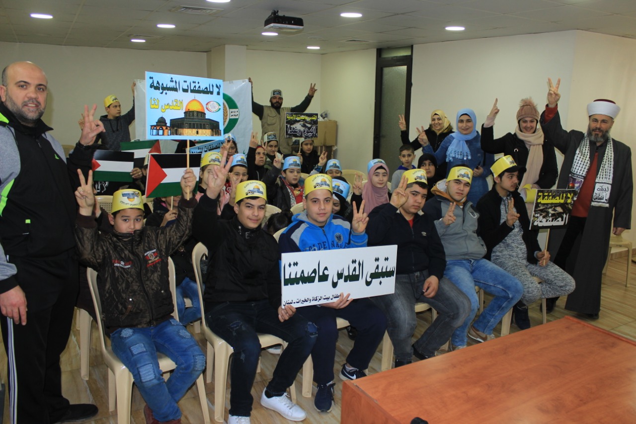 فكانت كلمة للشيخ جمال الأيوبي أوضح فيها أهمية القدس والاقصى في حياتنا، وخصوصاً لدى جيل متسلح بالعقيدة والانتماء، ينهض بالأمة لتكون قادرة على تحرير فلسطين كلها، وعاصمتها القدس الشريف، أولى القبلتين وثالث الحرمين الشريفين، وسَرَدَ تاريخ الصفقات والتنازلات بحق الأراضي المحتلة. ومن ثم توجه الجمع برفقة مدير قسم الأيتام الاستاذ مالك عيد والفريق الاداري إلى باحة مسجد الأمير طينال حاملين الأعلام الفلسطينية وصور المسجد الاقصى، رافعين لافتات منددة بالصفقة، مؤكدين حق الشعب الفلسطيني بتقرير مصيره وعدم التنازل عن شبر من أراضيه. داعين إلى بناء موقف عربي إسلامي موّحد في رفض هذه الصفقة المشبوهة كليا.