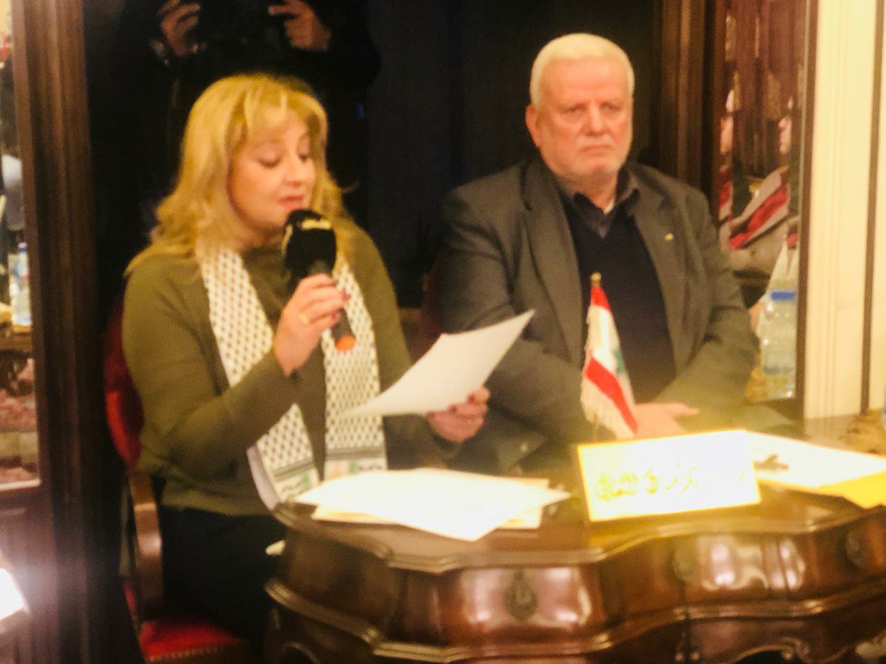 إستهلّت صاحبة الصالون ناريمان الجمل كلمتها بالترحيب بالضيف والحضور، و قالت: هذه الصفعة التي لولا تفتّت الداخل الفلسطيني وتشرذم العالم العربي لما تجرّأ ترامب والصهيوني عليها، فَفِلسطين ليست للشعب الفلسطيني فقط، فَلسطين التي تمتدُ من المحيط إلى الخليج هي لنا، من رأس الناقورة إلى أمّ الرشراش هي لنا، ولن نتنازل عن حبّة من ترابها؛ ولبنان هو الدولة الوحيدة، حكومةً وشعبًا، كان و ما يزال، وسيبقى رافضا للتطبيع، ونحن بسكوتنا نؤجّل حقّ عودة فلسطين إلى أهلها.