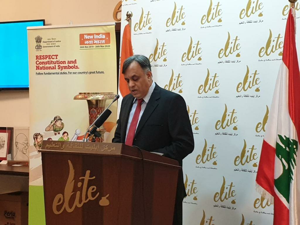 وألقى سفير الهند كلمة تحدث فيها عن مبادىء غاندي في الدستور الهندي فتناول مضمون الدستور وتطوره واجرى مقارنة مع الدستور اللبناني وقال: “وفقا للمهاتما غاندي، لا يمكن إنقاذ الديمقراطية إلا من خلال اللاعنف، لأن الديمقراطية، طالما كانت مدعومة بالعنف، لا يمكن أن تحمي الضعفاء وتدعمهم. ففي ظل الديمقراطية يجب أن يحصل الضعيف على الفرصة نفسها التي حصل عليها القوي. لذلك قال المهاتما غاندي إن هذا لا يمكن أن يحدث أبدا من خلال العنف ومن أجل القضاء على الاستغلال، يجب بناء مجتمع أو دولة غير عنيفة ويجب أن يقوم هذا المجتمع، بالضرورة، على الحرية الاقتصادية والمساواة، لأنه بدون العدالة الاقتصادية لا وجود لديمقراطية سياسية حقيقية، لذلك دافع غاندي عن اللامركزية في القوة الاقتصادية والسياسية في شكل مجتمعات قروية تتمتع بالاكتفاء الذاتي والحكم الذاتي. فقد اعتبر مثل هذه المجتمعات نموذجا لمنظمة غير عنيفة”.