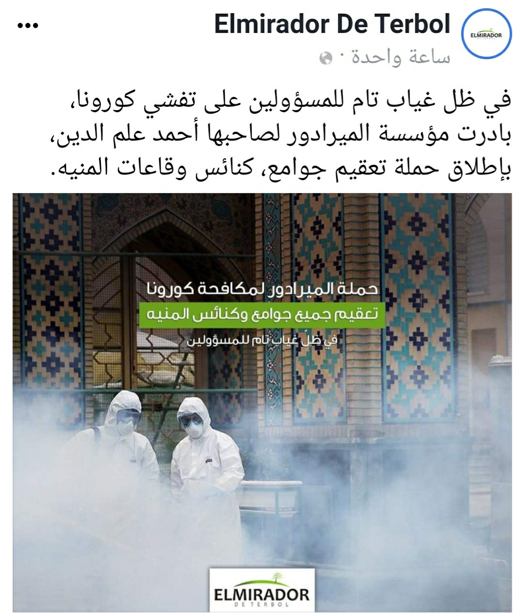 في ظل غياب تام للمسؤولين على تفشي كورونا، بمبادرة رئيس مجلس ادارة مؤسسة الميرادور أحمد علم الدين (الدوري) ، تم اطلاق حملة تعقيم جوامع، كنائس وقاعات المنيه.